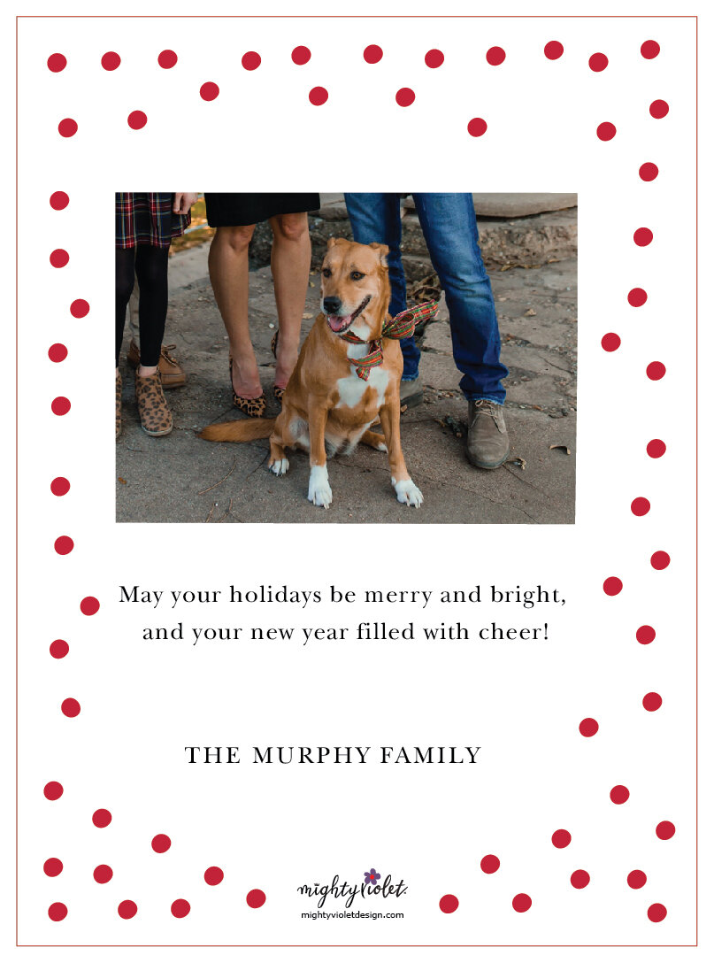 Send your picture(s). Attach photos (if desired) to your order, or send separately via email to holiday@mightyvioletdesign.com. You can also text to 773-798-9310. Super easy!